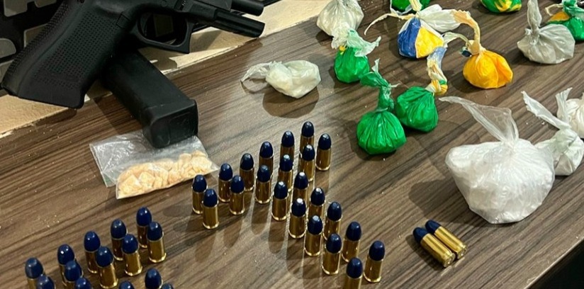 Policiais militares da Força Tática prenderam dois homens (idades não confirmadas), ontem à noite, acusados por tráfico de entorpecentes e porte ilegal de arma de fogo, durante abordagem numa via pública do bairro Veneza, em Lucas do Rio Verde. Na ação, foram apreendidas uma pistola calibre nove milímetros, 50 munições e 16 sacos contendo porções de maconha, cocaína e pasta base. Consta, no boletim de ocorrência, que a equipe patrulhava a área quando deparou com o acusado em área mal iluminada e usando uma tornozeleira eletrônica. Foi dada ordem de parada e, durante a revista pessoal, encontraram parte das drogas. Ele confessou que aguardava a chegada de um “comprador” e que teria mais materiais ilícitos em seu imóvel. Além dos entorpecentes, a equipe anda constatou a presença da arma de fogo e munições. Ao ser questionado sobre o consumo, ele também relatou que teria outras trouxinhas no endereço onde reside. Após a recolha, ambos foram encaminhados à delegacia municipal.
