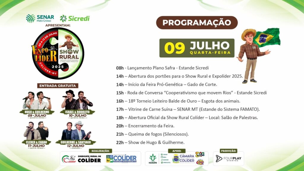 O presidente do Sindicato Rural Luiz Carlos Moia destacou que os portões estarão abertos a partir das 14h para o Show Rural e às 18h, será feita a abertura oficial da festa (Show Rural e Expolíder). Ele aproveitou para convidar a todos para esta grande festa, que terá entrada gratuita durante todas as noites.