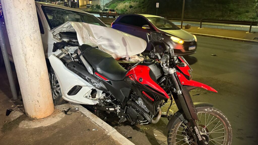 Um policial militar da reserva causou um acidente com um carro e uma motocicleta, ontem à noite, na avenida Miguel Sutil, no Despraiado, em Cuiabá. Bastante alterado, ele ainda agrediu a repórter Angélica Gomes, da TV Vila Real, com um soco no rosto.